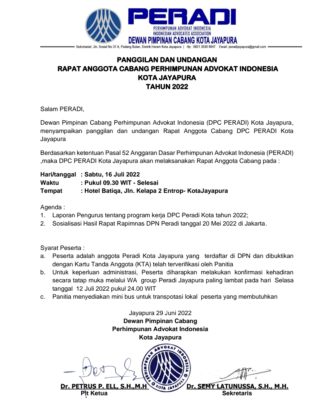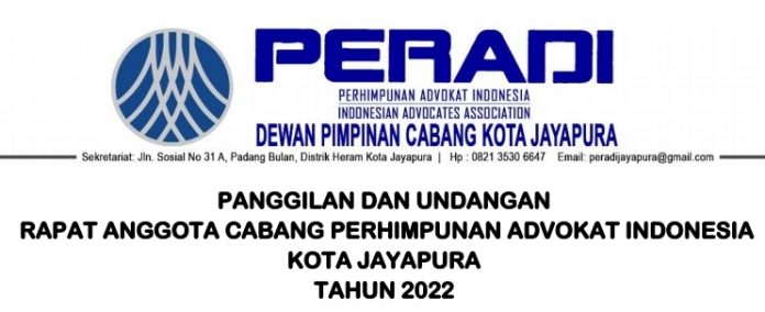 PANGGILAN DAN UNDANGAN RAPAT ANGGOTA CABANG PERHIMPUNAN ADVOKAT INDONESIA KOTA JAYAPURA TAHUN 2022